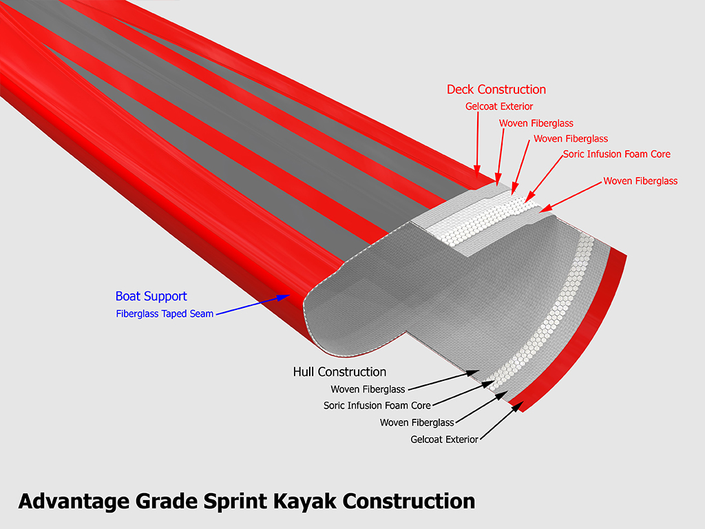 Description: Great combination of weight, stiffness, durability and cost. Gelcoat finished heat cured infused epoxy Fiberglass and Soric® core laminate is very tough and resists against punctures. A great race boat on a tight budget. The Advantage hits the mark for price to weight ratio for most kayak paddlers.