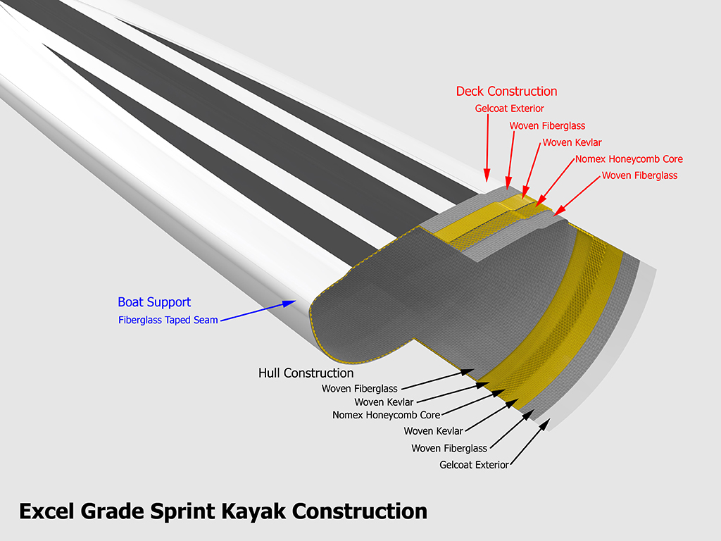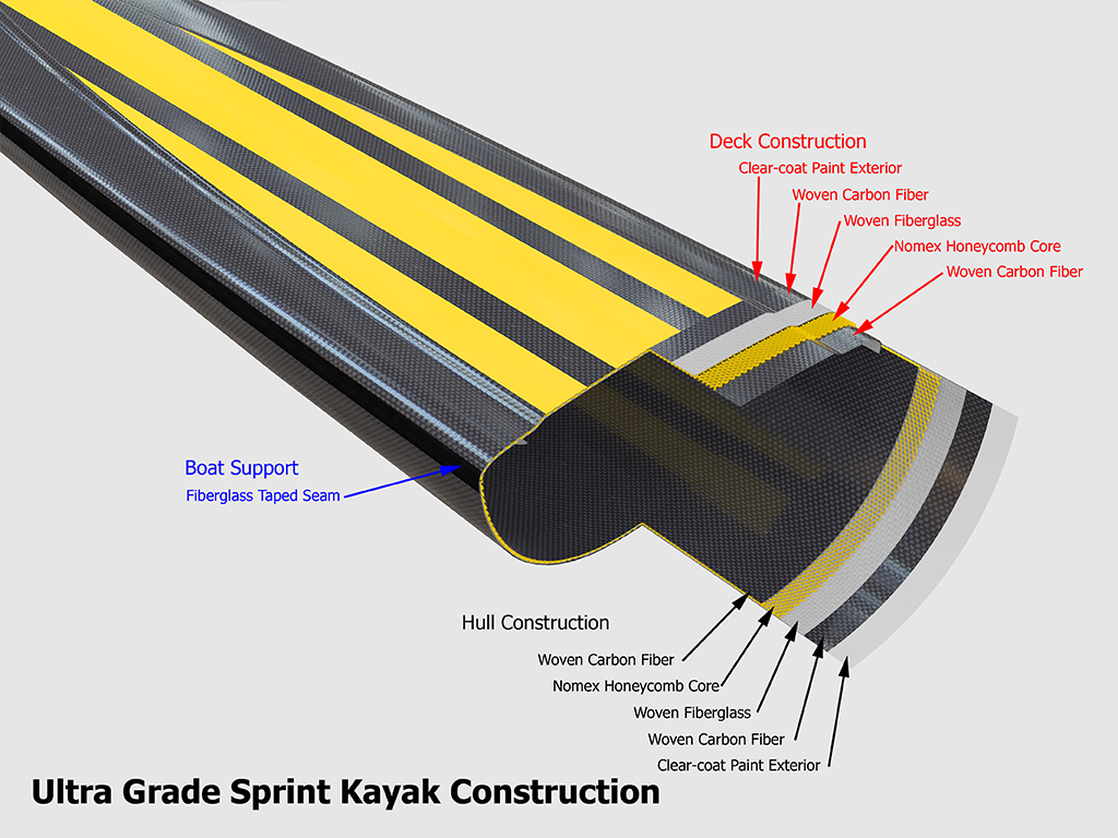 Description: Very stiff and light, yet more affordable than the Alpha. Kevlar® adds impact strength to the laminate - Gelcoat finished heat cured epoxy Kevlar® and Fiberglass laminate with Nomex® Honeycomb Core. Great for racing, or those looking for a light boat, but not ideal for shallow water paddling.