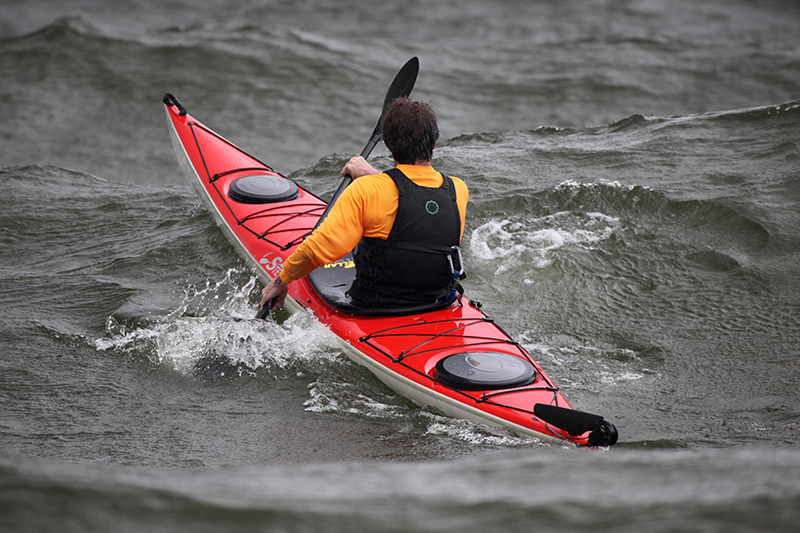 In windy conditions and open water, make sure to use spray skirt and have safety devises such as pumps, flares, radios, cell phone etc. As always, you should always paddle with a partner and use proper flotation devices such as a PFD and know your ability level and anticipate any severe weather.