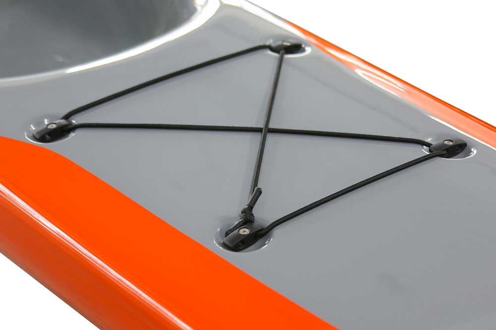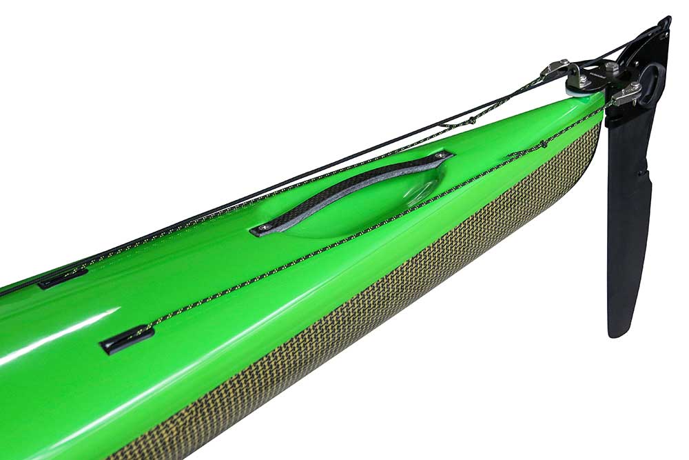 Description: Single skin laminate hull made of Carbon & Kevlar® fabric, with clear gelcoat finish, and the deck is the standard Advantage construction. The hull is designed to be flexible and durable, but creates a stiff boat that can take some abuse in the class I and II rapids and shallows, but is also at home in the ocean or the flats. The Surf Ski Multi-Sport construction comes standard with an over-stern rudder and fittings for an under-stern rudder, as well as a flush mounted Andersen Super mini-bailer.