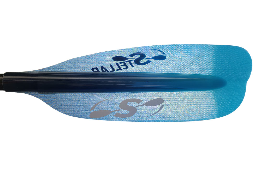 The Stellar Swing paddle is a traditional shape for more relaxed €œLow Angle€ paddling. This paddle is ideal for wider boats, fishing kayaks and recreational paddling. The Swing is designed so the blade enters the water easily with minimal splash and maximal smoothness. The blade has a dihedreal shape to provide stability in the water. The swing is offered in the Fusion construction, a beautiful translucent blue fade fiberglass blade with reinforcement at the tip to help fend off damage while paddling or during transportation. The swing comes standard with a tension adjustable cam, allowing for 10cm of length adjustment and any feather angle. The round shaft settles comfortably into your hand and the carbon/fiberglass laminate is lightweight, with an ideal blend of stiffness and flex, while looking great.